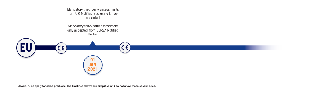 - Where a product has third-party assessment from an EU appointed Notified Body located in the UK, the files will need to have been transferred to an EU-27 Notified Body before 1st January 2021 or a new assessment completed by an EU-27 Notified Body